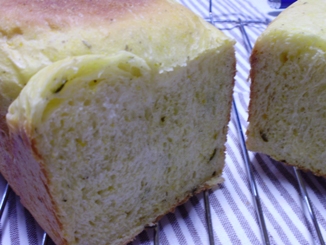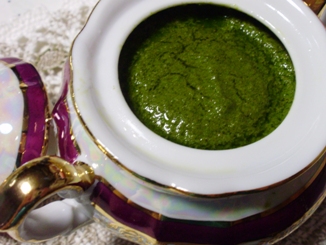 かぼちゃを入れたパンにさらにタイム、ペパーミントのハーブパウダーを入れました。かなりスパイシーな香り、味の上、このバジルソースをつけるとハーブハーブしています(笑)